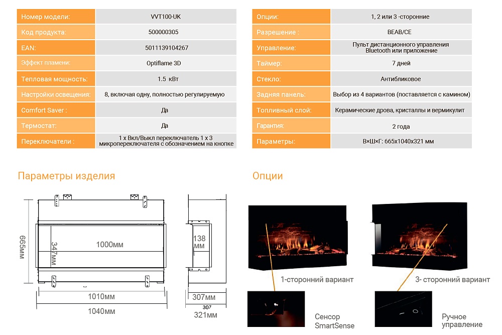 В очагах реализована опция выбора интенсивности пламени и цвета подсветки из 8 различных вариантов. Дополнительно предусмотрена функция автономного обогрева.