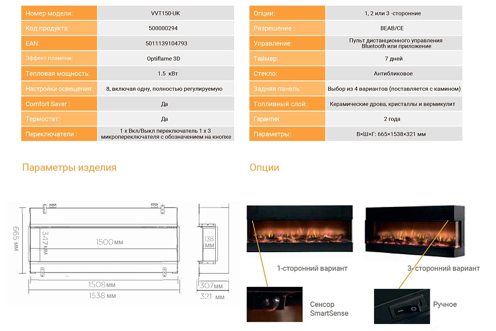 Пользователям доступно три варианта компоновки: одна стеклянная панель для яркого фронтального огня, две панели для угловой установки или три панели для панорамного вида пламени. Помимо этого для каминов Vivente предусмотрено 4 различных варианта облицовки задней панели и несколько вариантов внутреннего декора.