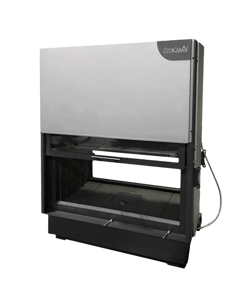 Ребра жесткости по всему корпусу топки и встроенные в дымосборник тепловые каналы позволяют снимать больше тепла и отдавать его в помещение путем конвекции. Высокий дымосборник и пламярассекатель не позволяют дымовым газам попадать в помещение при открывании дверцы. Бесшумная и надежная тросовая система с противовесом и жаропрочными подшипниками, позволяет открывать дверцу топки вверх и производить закладку дров в топочную камеру. Для оптимизации процессов горения все регулировки подачи воздуха на систему первичное горение, систему очистки стекла и встроенную шиберную заслонку производятся специальным ключом «ХОЛОДНАЯ РУКА». Под чугунной колосниковой решеткой в днище топки, находится большой зольный ящик, который удобно вынимается. Устойчивые, регулируемые по высоте ножки, позволяют при монтаже установить топку по уровню.