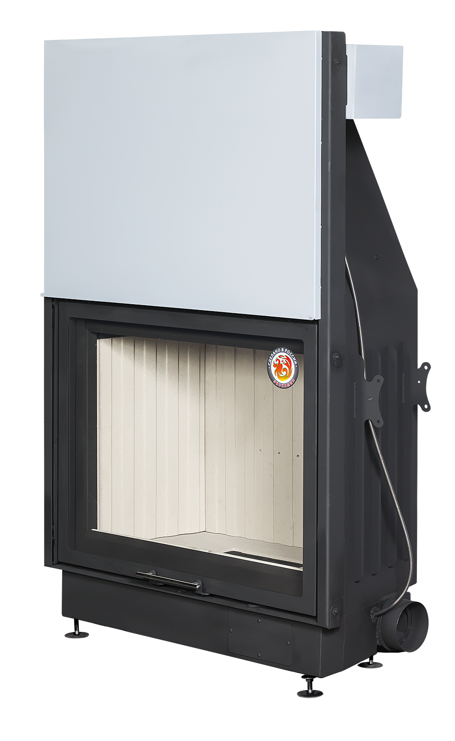 Топки ВЕГА это сплав наших знаний о современных Европейских тенденциях в области создания каминных топок и требований отечественного покупателя к удобству эксплуатации, внешнему виду и надежности камина. Наши топки принесут в ваш дом атмосферу комфорта, и отлично впишутся в любой интерьер. Мы производим каминные топки из высококачественной котельной стали и наносим термостойкое лакокрасочное покрытие с антикоррозийными свойствами. Топки серии ВЕГА имеют следующие конструктивные особенности: Топочная камера футерована современным материалом, литьевым шамотом бежевого или черного цвета (по желанию покупателя) и надежно защищает металлические детали корпуса топки от перегрева. Жаропочное стекло из Японии способно выдерживать температуру до 750 С. Система тепловой разводки имеет два встроенных патрубка диаметром 125 мм для подключения системы распределения теплого воздуха в смежные помещения и позволяет увеличить площадь обогреваемых помещений. Система забора воздуха извне, имеет два встроенных патрубка диаметром 125 мм для подключения забора воздуха на горение из соседнего помещения, улицы, подвала, и повышает надежность работы топки. Система очистки стекла эффективно очищает жаропрочное стекло и позволяет любоваться красотой огня. Система вторичного дожега увеличивает КПД топки и позволяет экономить дрова. Встроенная шиберная заслонка позволяет увеличивать/уменьшать сечение дымового канала и регулирует мощность топки. Ребра жесткости по всему корпусу топки и встроенные в дымосборник тепловые каналы позволяют снимать больше тепла и отдавать его в помещение путем конвекции. Высокий дымосборник и пламярассекатель не позволяют дымовым газам попадать в помещение при открывании дверцы. Бесшумная и надежная тросовая система с противовесом и жаропрочными подшипниками, позволяет открывать дверцу топки вверх и производить закладку дров в топочную камеру. Для оптимизации процессов горения все регулировки подачи воздуха на систему первичное горение, систему очистки стекла и встроенную шиберную заслонку производятся специальным ключом «ХОЛОДНАЯ РУКА». Под чугунной колосниковой решеткой в днище топки, находится большой зольный ящик, который удобно вынимается. Устойчивые, регулируемые по высоте ножки, позволяют при монтаже установить топку по уровню.