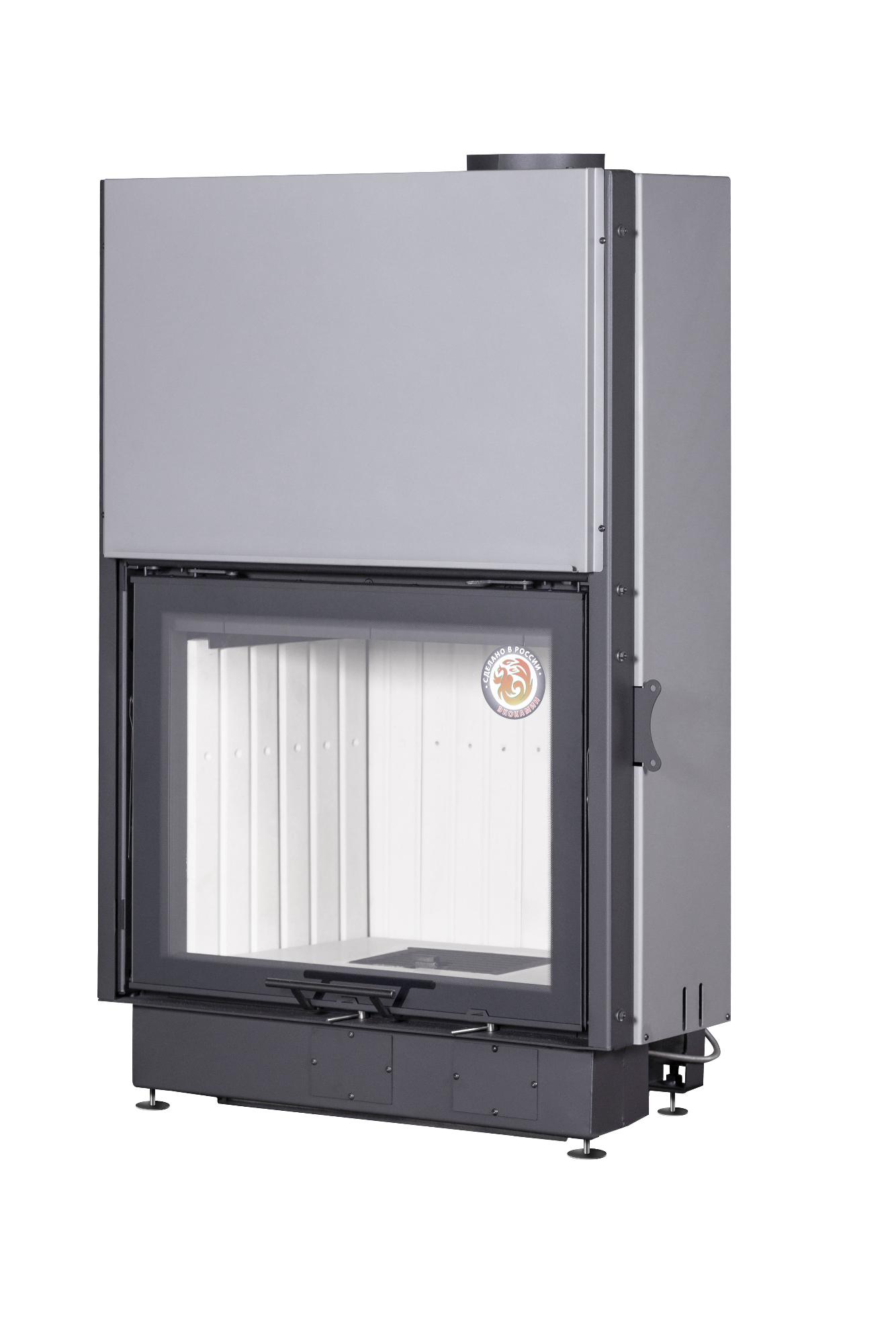 Ребра жесткости по всему корпусу топки и встроенные в дымосборник тепловые каналы позволяют снимать больше тепла и отдавать его в помещение путем конвекции. Высокий дымосборник и пламярассекатель не позволяют дымовым газам попадать в помещение при открывании дверцы. Бесшумная и надежная тросовая система с противовесом и жаропрочными подшипниками, позволяет открывать дверцу топки вверх и производить закладку дров в топочную камеру. Для оптимизации процессов горения все регулировки подачи воздуха на систему первичное горение, систему очистки стекла и встроенную шиберную заслонку производятся специальным ключом «ХОЛОДНАЯ РУКА». Под чугунной колосниковой решеткой в днище топки, находится большой зольный ящик, который удобно вынимается. Устойчивые, регулируемые по высоте ножки, позволяют при монтаже установить топку по уровню.